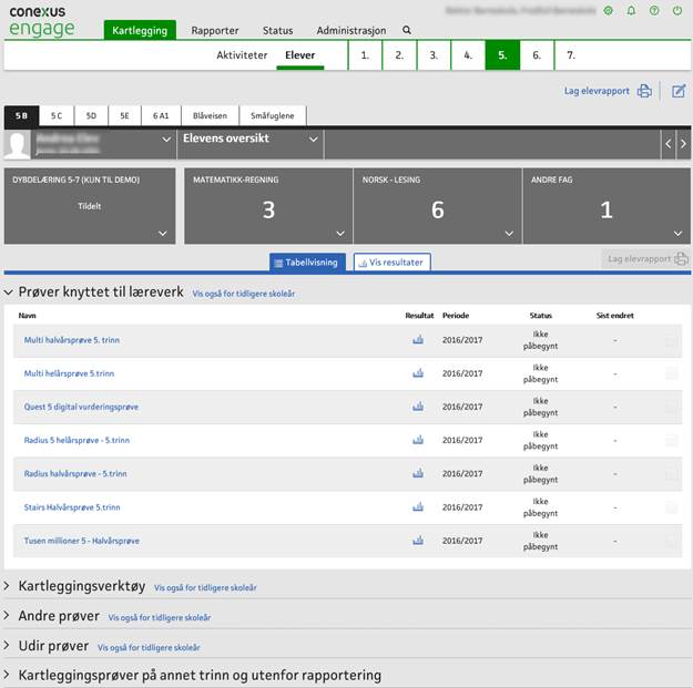 På Elevens oversikt kan du se elevens resultater på kartleggingsprøver og kartleggingsverktøy for inneværende- og tidligere perioder. Et skoleår er delt i to perioder, høst og vår.