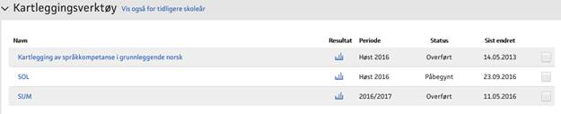 Klikk på en rad for valgt kartleggingsverktøy for å se besvarelsens tilhørende registreringsskjema og tilgjengelige resultatvisningsformer.