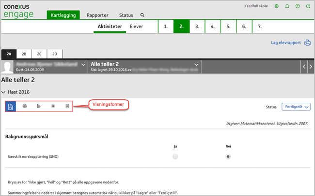 Når du har valgt en elev har du mulighet til å se resultatet i flere visningsformer. Hvilke visningsformer som er tilgjengelig er forskjellig fra prøve til prøve.