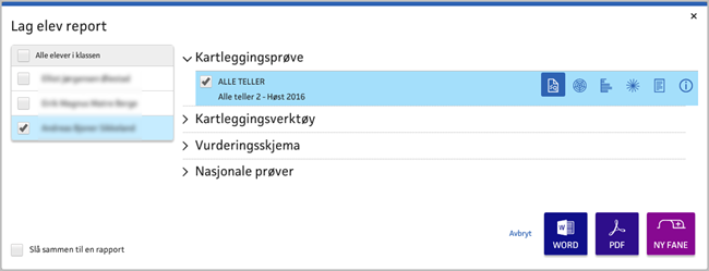 Valgt elev er merket i venstre felt. Du kan velge prøver og verktøy, visningsformer og ulike eksport-/utskriftsalternativer for rapporten.